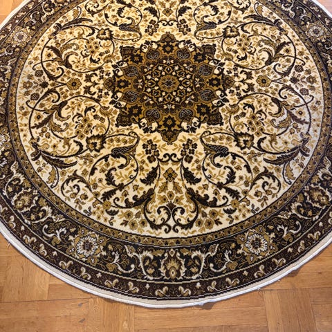 Persisk Ny rund matta med orientalinspirerat mönster i flera färger mot ljus botten. NY SKICK plasten finns kvar på sidorna av mattan säljs pga utlandsflytt