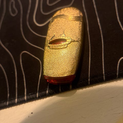 Tändare i metall med gångjärnslock och bensin/sten-tändmekanism. Framsidan har färgglatt motiv med texten "Horny Little Devil" och en röd figur mot gul/orange bakgrund. Passar som vardagständare eller som samlarobjekt för motivtändare. Bränsle och tändsten ingår normalt inte utan fylls på vid behov.
