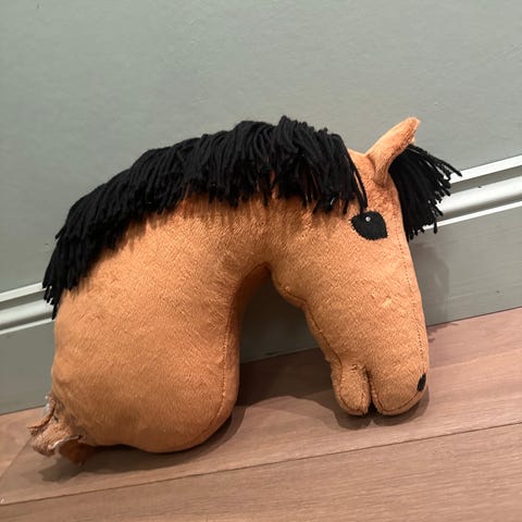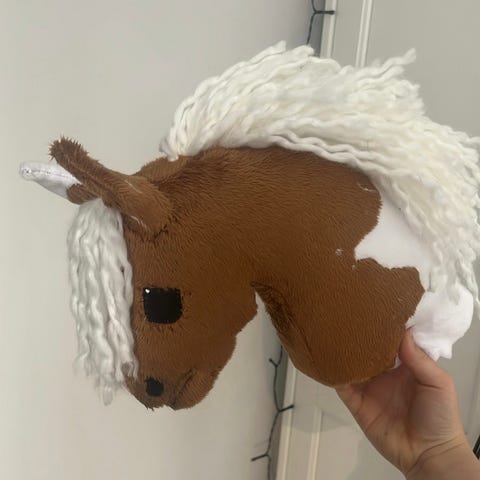 Hand sydd käpphäst i velboa tyg stoppad med vliselin