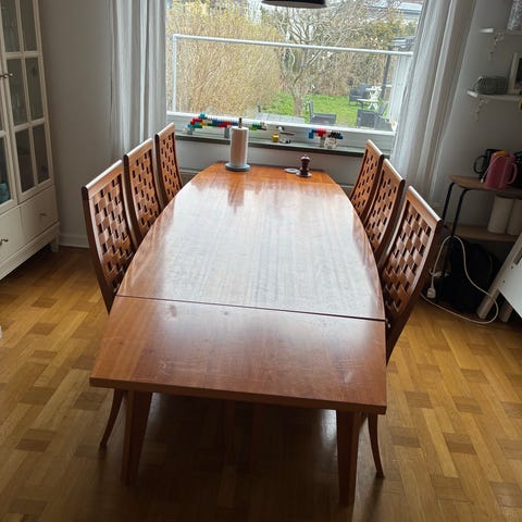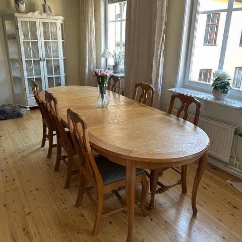 Rejält köksbord i massivt trä med fällbara sidor samt tillhörande stolar.