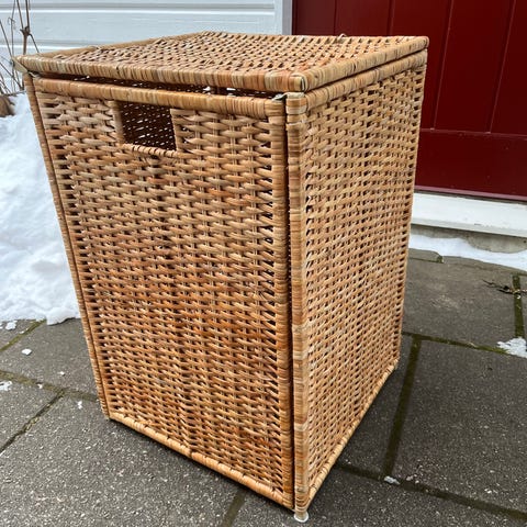 Fin stor flätad tvättkorg i rotting. 70 cm hög och 50 cm bred. I mycket fint skick.