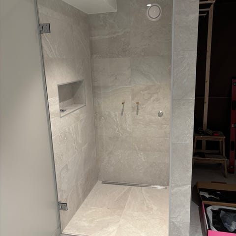 Duschdörr i glas med kromad nischprofil som