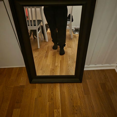 60x90 cm . IKEA spegel med svart ram. Rektangulär modell som kan hängas på vägg. Passar i hall, sovrum eller vardagsrum för spegling och som inredningsdetalj. Ram i mörk färg med markerad profil. Monteringsbeslag på baksidan för upphängning.