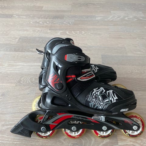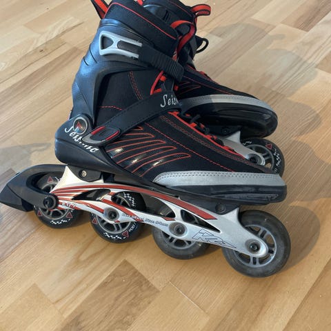 Roces inlines rullskridskor i storlek 40. Färgkombination i svart och grått med röda detaljer. Modellen har justerbara spännen och remmar för att hålla foten på plats. Hjul monterade i rad med broms bak på ena skridskon. Passar för rullskridskoåkning utomhus på jämna underlag.