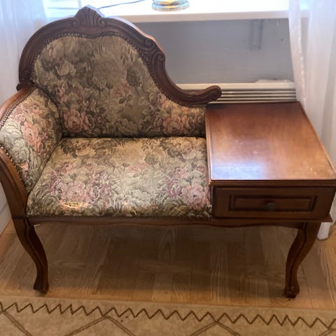 Telefonsoffa i trä med röd, knapptuftad och stoppad sits och rygg. Soffan har ett integrerat sidobord med en utdragbar låda för förvaring. Ben och stomme är svängda i klassisk stil. Passar exempelvis i hall, vardagsrum eller som sittplats eller mindre avlastningsyta.