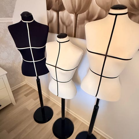 Bystdocka provdocka i beige textil med svart paris-motiv, inklusive Eiffeltornet och texttryck. Dockan är monterad på svart stativ med fot. Lämplig som provdocka, dekoration eller visning av kläder och accessoarer i hem eller butik.