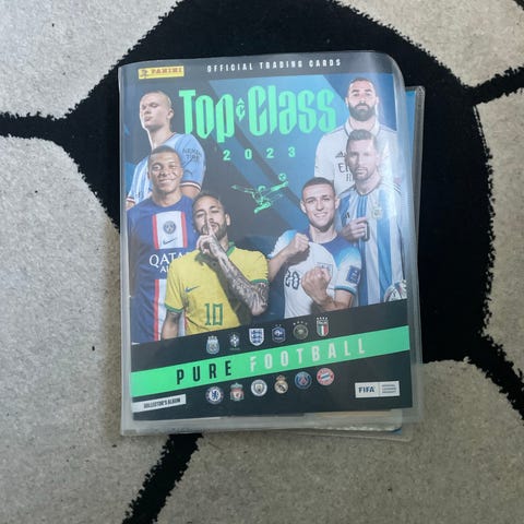 Panini FIFA samlingsalbum som är fyllt med fotbollskort från flera olika lag.