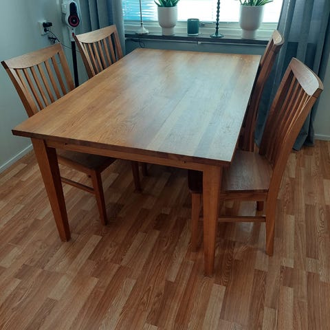 Väldigt fint träbord med tre stolar. Bordet är i nuläget nermonterat men lätt att sätta ihop.