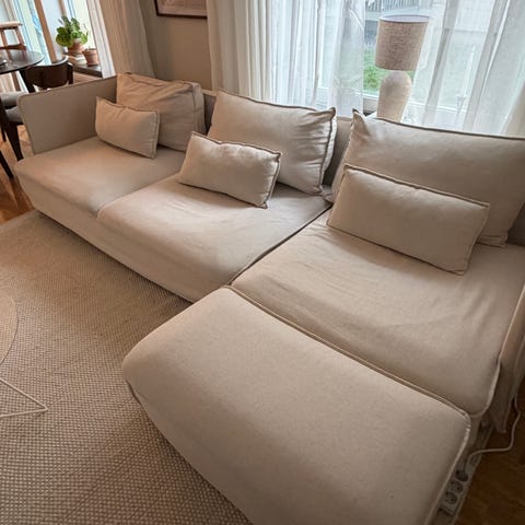 Vit 3-sits soffa med fotpall från IKEA Söderhamn-serien.