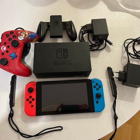 Nintendo Switch spelkonsol med blå och röd Joy-Con-kontroll, dockningsstation, handkontrollhållare, nätadapter och laddkabel. Konsolen är bärbar men kan även kopplas till TV via dockan för stationärt spelande. Passar för både enspelarläge och flerspelarläge lokalt eller online, beroende på spel och uppkoppling.