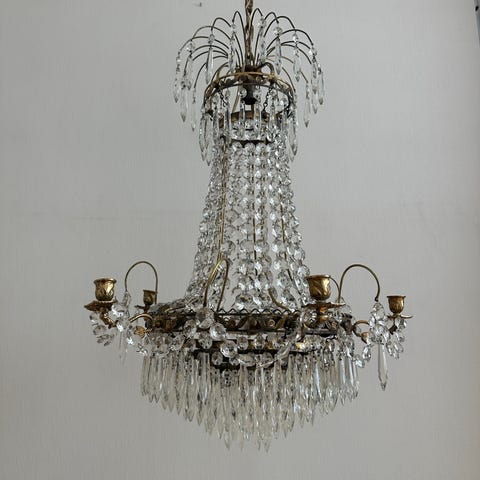 Ljuskrona Gustaviansk mid 1900-tal. Mässing med glaskristall. H70cm, diameter 54cm. 7st ljushållare. Tel 070-748 54 90