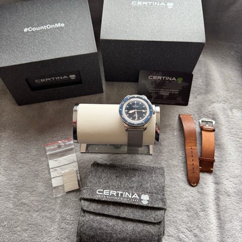 Certina DS Super PH500M Special Edition VDST med orange urtavla. Klockan har ett automatiskt urverk och kommer med ett mesharmband i stål, ett svart gummiarmband och extra länkbitar i svart. Klockan är en specialutgåva i samarbete med VDST (Association of German Sport Divers).