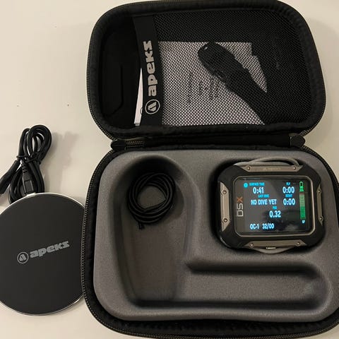 Shearwater Perdix dykdator. Elektronisk dykdator med en stor rektangulär display och robust ytterhölje. Levereras med skyddsväska, handledsremmar, extra saft batteri 3,6 V, nya o-ringar och medföljande dokumentation enligt bilder. Nära nyskick, har skärmskydd vilket fått sig en liten repa. Syns enbart vid avstängd enhet och påverkar inte displayen under dyk.