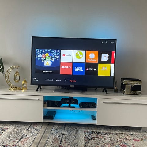 En svart tv bänk,säljer pga ingen användning längre,följer med en ”nyckel” så man kan låsa skåpdörrarna(dem öppnas/stängs med ett tryck på glaset) hål på baksidan för sladdar, även hjul på så går att rulla, ena hjulet har lossnat(skickas med så kanske går och sätta på igen) men den fungerar fortfarande perfekt