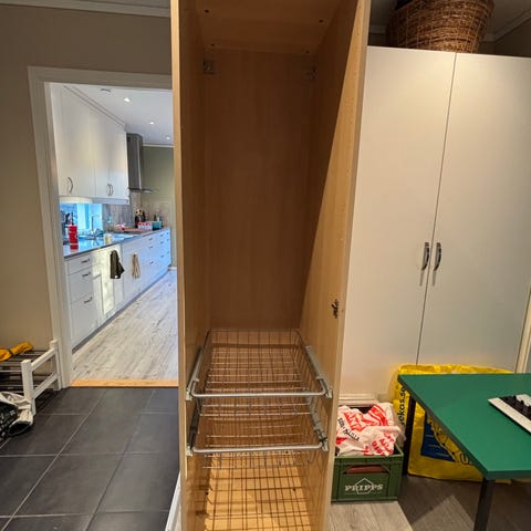Lite äldre modell av Pax stomme i ask, med spegeldörr åt vänster och vit dörr åt höger. Svarta handtag och silver skohyllor (Plus 2 extra hyllplan som står i källaren). Hängare till galgar ingår samt batteridriven belysning. Hämtas i Hisings Backa, hiss finns i byggnaden. Kan demonteras på plats!