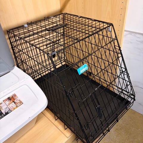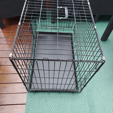 Hundbur i svart metall med sned framkant. Buren har gallerkonstruktion med en dörr framtill.