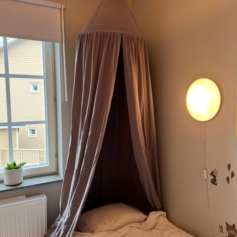 Very nice “Sänghimmel” for kids bedroom. It’s in good used condition, no stains just needs some ironing if wished. Easy to wash and the fabric is cotton. Pick it up in Huddinge Centrum.