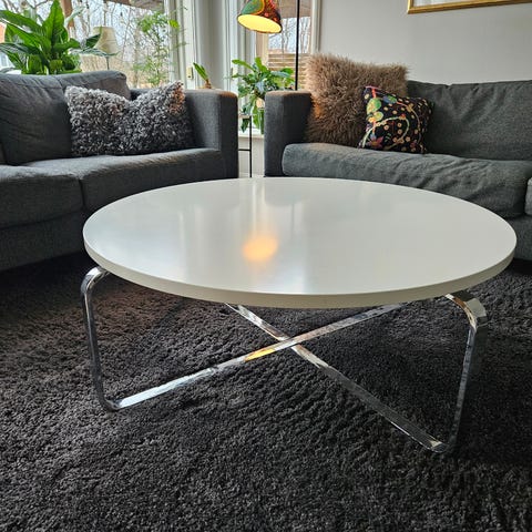 Runt soffbord som kan vridas åt sidan, den är i ny skick inga större repor en mindre fläck om ni vill ha både tv bord och soffbordet så kostar dem 1000 tillsammans