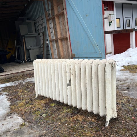 Vit panelradiator med termostatventil och anslutningsrör. Avsedd för vattenburet värmesystem i inomhusmiljö. Passar för montering på vägg i bostad eller lokal där elementvärme önskas. Storlek och effekt okända, kan kompletteras med egna mått vid behov.