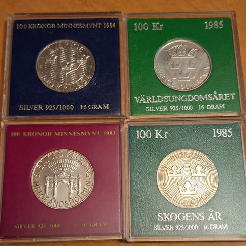 Sveriges riksbank 200 kr silvermynt samling. Mynten är utgivna som minnesmynt i silver och presenteras styckvis i originalkapslar med informationskort. Samlingen omfattar olika utgivningsår och motiv, bland annat sport- och jubileumsteman. Varje mynt har valören 200 kronor och är präglat i silver med angiven vikt och silverhalt på respektive kort. Lämplig för samlare av svenska minnesmynt och numismatikintresserade.