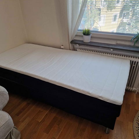Mio säng med bäddmadrass 90 cm bred med vita ben och bäddmadrass.