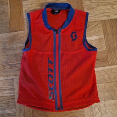 Scott ryggskydd i form av väst för barn. Storlek XS, angiven längd 124–140 cm och ålder 7–9 år. Västen är blå med gröna detaljer och dragkedja framtill. Baksidan har integrerat ryggskydd och insidan har justerbara kardborreband i midjan för bättre passform. Lämplig för exempelvis cykling eller andra aktiviteter där extra ryggskydd önskas. Nytvättat och i mycket bra skick