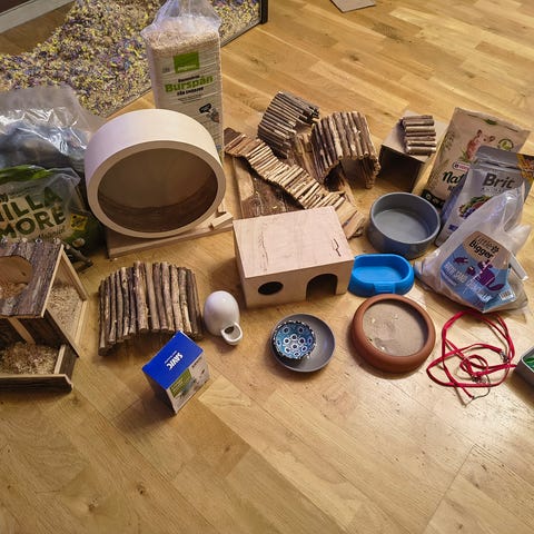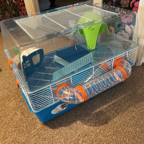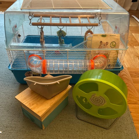 Medföljer vattenflaska, löphjul, matskål, tunnel/stock och en mindre transportbur i grön plast med transparent lock. Lämplig för mindre gnagare som hamster eller mus.