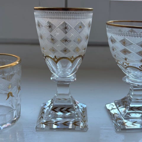 Otroligt fina glas i kristall med graverat mönster föreställande stjärnor och stjärnfall. Exklusiva, klassiska och eleganta med en modern design samtidigt som man ser den tidstypiska formen. Perfekt till en finare middag. Bara glasen i sig gör hela dukningen. Har 4st. Jag har även likör, cherry glas ifrån samma designer. Ovanligt med denna etsning.