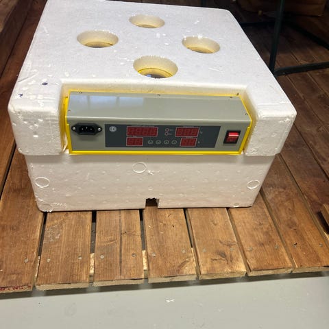 River Covina Super 24A självvändande äggkläckningsmaskin i grön färg. Maskinen är avsedd för kläckning av ägg och har digital display på ovansidan för inställning och avläsning av funktioner. På bilderna syns tillhörande manualer och dokumentation från återförsäljare. Lämplig för mindre fjäderfäuppfödning där man vill kläcka ägg i kontrollerad miljö.