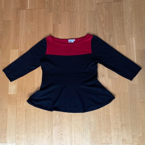 En svart-röd tröja i ledig passform från Isolde (Dea Axelsson) i storlek S. Tröjan har rund halsringning och 7/8 arm. Den är 58 cm lång, 42 bredd. 82% viskos och 18% polyamid. I normalt begagnat skick, helt, ren.