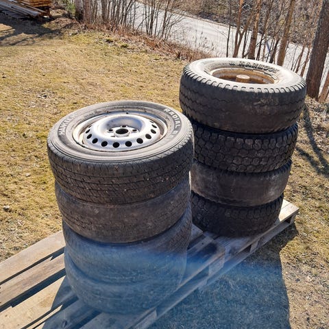 Bridgestone däck med fälgar. Kompletta hjul med monterade däck på stålfälgar, lämpliga för fordon där denna dimension och bultdelning passar. Däcken är monterade på rostangripna men funktionsdugliga fälgar enligt bilderna.