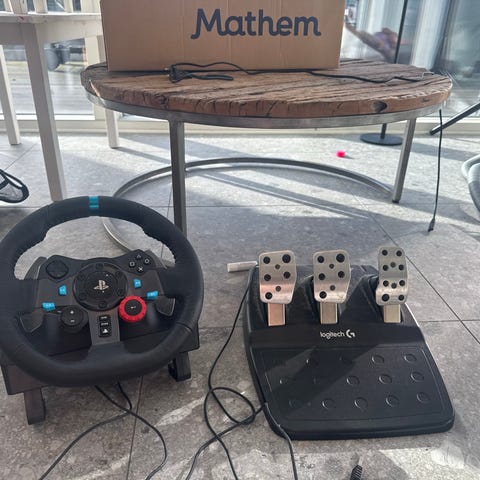 Logitech G29 racerratt med pedaler i svart utförande. Ratten har inbyggda knappar, styrkors och reglage anpassade för spelkonsol med PlayStation-knappar. Pedalenheten har tre pedaler för gas, broms och koppling med metallpedaler och plastbas. Utrustningen är avsedd för racingspel och körsimulatorer och monteras på bord eller liknande yta med fästen på undersidan av ratten.