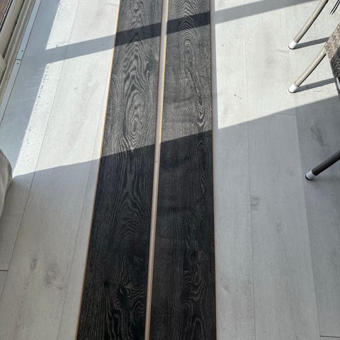 Golvet levereras i paket som syns på bilderna. Ytan har ett mönster som efterliknar trä med ljusa, neutrala toner. Kork på undersidan.