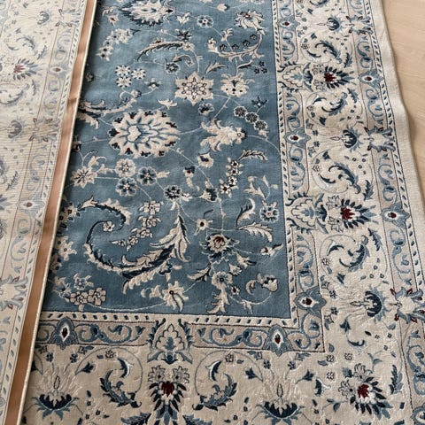 Rugvista matta i jättefint skick. Mycket sparsamt använd. Härliga färger som går i rostrött med fina detaljer. 7mm tjock.
