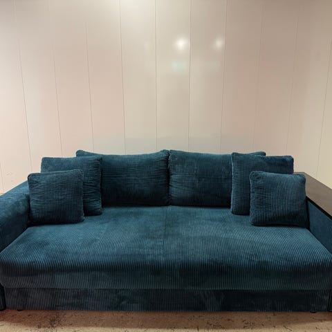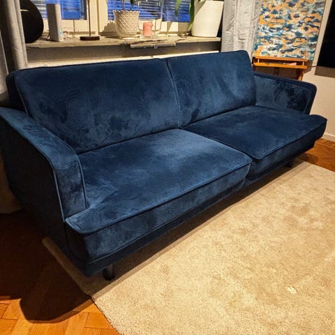 Säljer en fin blå 3-sits soffa i sammet.