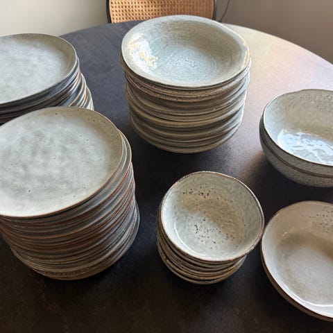 Tallriken är handgjord i keramik och har en härlig glasyr som kan skifta från ljusgrå till ljusblå. Varje tallrik är unik och har sitt eget utseende vilket bidrar till den rustika känslan och gör dukningen lite mer levande.