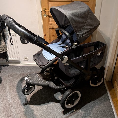 Emmaljunga barnvagn i svart/grå färg. Vagnen har ställbart handtag, sufflett och sittdel med sele. Framhjulen är svängbara och bakhjulen större för stabilitet. Under vagnen finns en varukorg. Passar för barn som kan sitta själva och kan användas vid vardagliga promenader och ärenden.