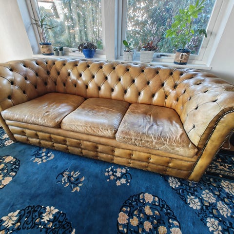 Chesterfieldgrupp, tre sitts med två fåtöljer i äkta skinn.