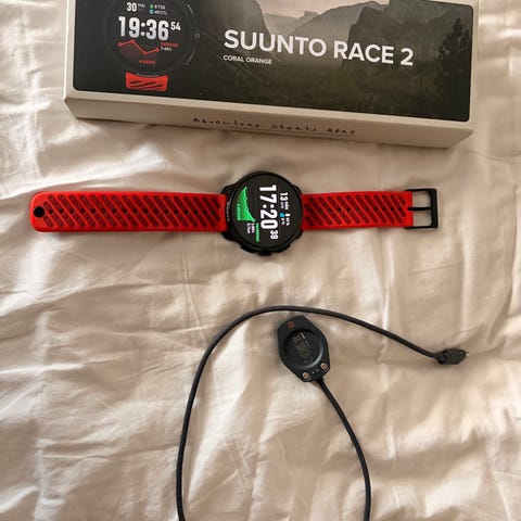 Klockan levereras i originalförpackning tillsammans med flera extra utbytbara armband i olika färger samt laddkabel. Batteriet är mycket bra skicka, mindre synliga repor på glaset.