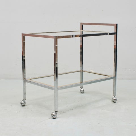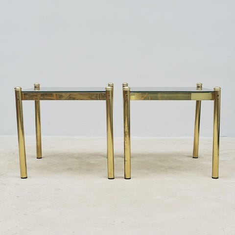Soffbord i kvadratisk modell med skiva samt underhylla i glas. Stomme i mässing. Bordet är försett med hjul för enkel förflyttning.