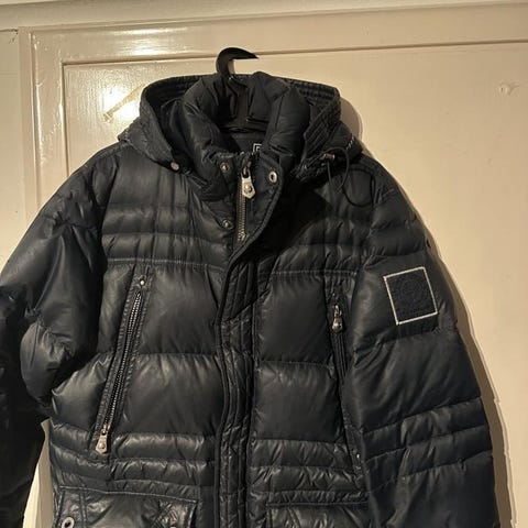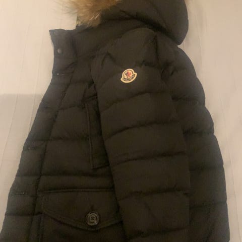 Moncler dunjacka i storlek 2. Jackan är svart med Moncler-logotyp på vänster ärm. Den har en avtagbar huva och flera fickor
