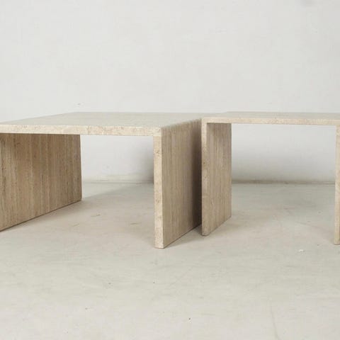 New Works sidobord i ljus travertin med geometrisk, asymmetrisk form. Bordet har två nivåer som kan användas för avställning av exempelvis böcker, lampor eller dekoration. Passar som soffbord, sängbord eller sidobord i vardagsrum, sovrum eller hall.