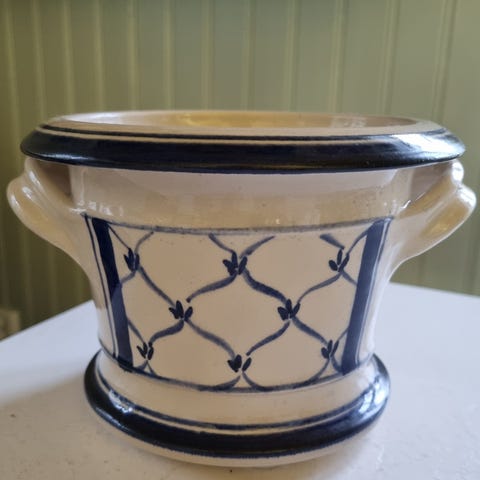 Set med tre krukor i porslin i vit färg med blå dekor och guldfärgade detaljer. Krukorna har handtag på sidorna och är i olika storlekar, lämpliga som ytterkrukor eller dekorationskärl inomhus.
