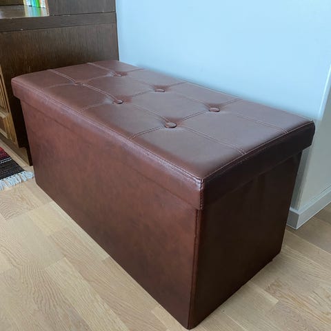 Mörkbrun sittpuff/ottoman med förvaring. Den har en vadderad sits i konstläder och knappdetaljer (tuftning). Passar överallt i hemmet och är enkel att flytta då den är vikbar.