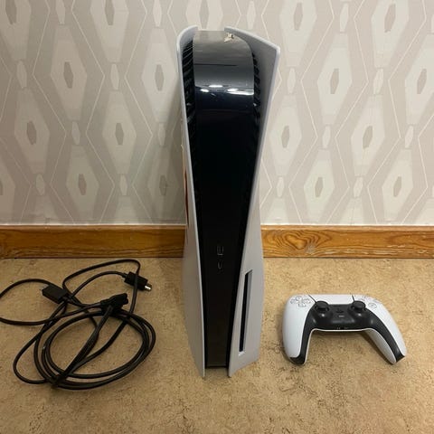 Sony PlayStation 5 spelkonsol vit med handkontroll och kablar
