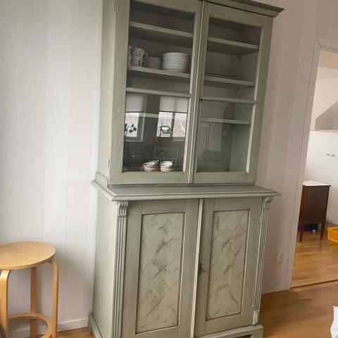 Vitrinskåp i trä med brun finish och glasdörrar i mitten med krysspröjs. Skåpet har två hela dörrar på sidorna och två glasdörrar i mitten. Invändigt finns flera hyllplan för förvaring av porslin, glas eller andra föremål. Skåpet står på ben med dekorativ utformning och passar exempelvis i vardagsrum eller matsal som förvarings- och vitrinskåp.