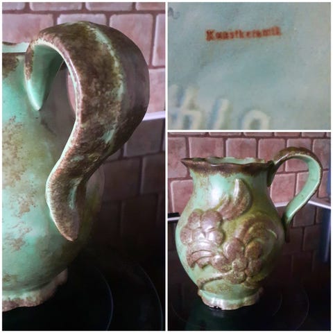 I lergods med tre hänklar. Design Erik Mornils för Nittsjö. I den karaktäristiska gröna marmorerade/ flammiga glasyren. Stämplad och märkt undertill. Fint skick enligt bilder. Ca 20 cm hög, diameter öppning ca 13,5 cm, största diameter ca 20 cm. Väldigt dekorativ! Värderad nyligen till ca 800-1000 kr.