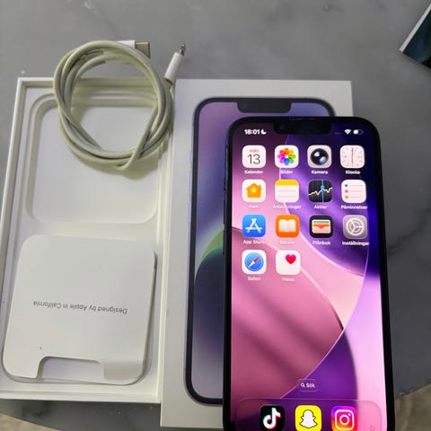 Säljer en iPhone 14 (128 GB) i mycket fint skick. Telefonen har ett helt nytt, diagnostiskt batteri på 100 %, utan några som helst felmeddelanden om kopior eller varningar – allt är korrekt och fungerar precis som det ska.