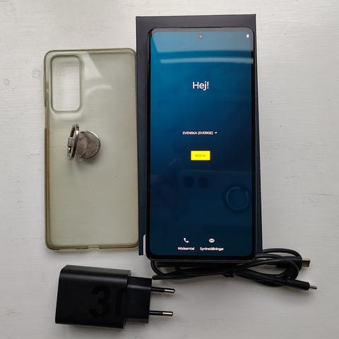 2 sim kort. Välfungerande,Följer med fodralen och USB C laddnings kabel. Mycket bra batteri