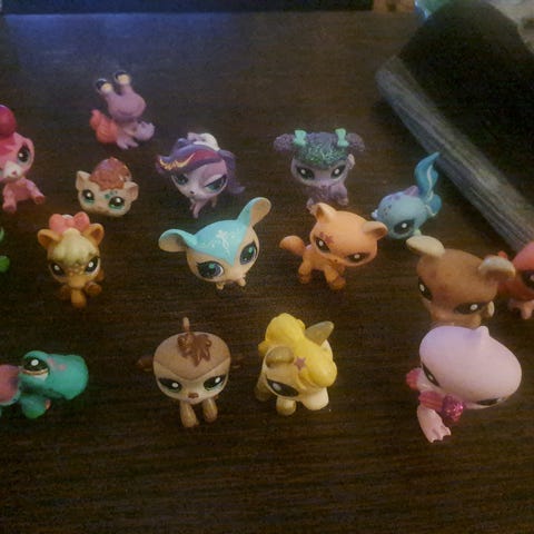 Littlest Pet Shop figurer, mindre plastfigurer föreställande olika djur i blandade färger. Setet innehåller flera olika typer av djur, exempelvis kaniner, katter, hundar och andra fantasidjur. Figurerna är små och passar för lek, samling eller som tillbehör i dockhus och liknande miljöer. Alla figurer är av hårdplast med målade detaljer och stora karakteristiska ögon.